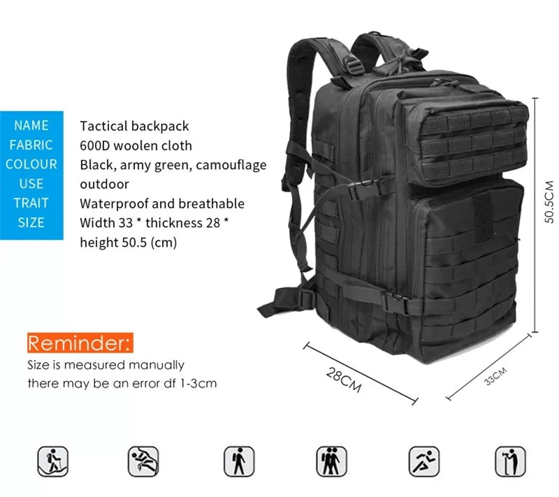 Bereiten Sie sich mit diesem robusten, wasserdichten 900D-Rucksack auf Ihr nächstes Abenteuer vor! Perfekt zum Wandern, Camping, Trekking, Angeln oder Jagen. Er ist geräumig und robust genug für alle Outdoor-Bedingungen. Maße: 50 x 33 x 28 cm.