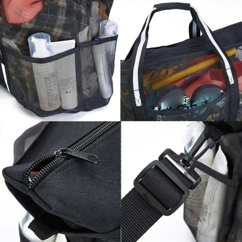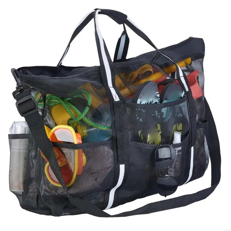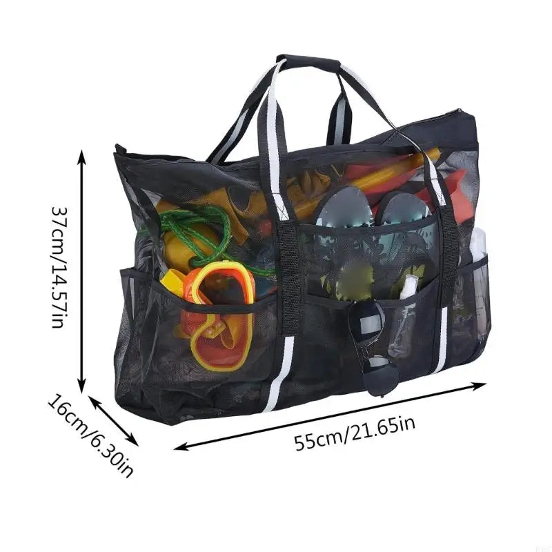 Extragroße Netz-Strandtasche D46C – Leichte Nylon-Tragetasche mit Reißverschluss und Taschen für Reise-, Pool- und Sommerausrüstung