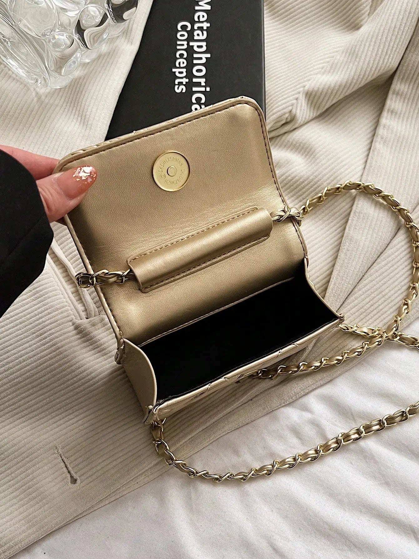 Schulter-Crossbody-Minitasche für Damen mit goldenem Kugelkettenriemen, vielseitige Textur, PU-Leder